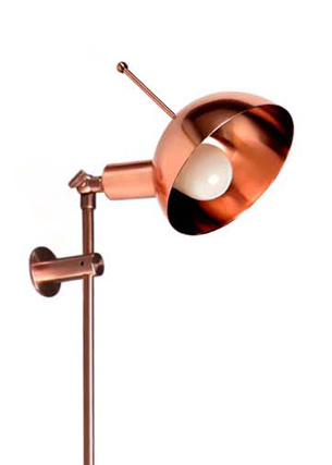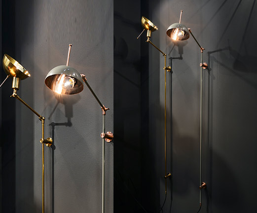 The head which is mounted on a metal stick takes its energy from the power socket and feels more free. The dual butterfly hinge augments the movability of the head. The lamp can be manufactured from copper, brass or nickel and powder coated in RAL colors. The inner reflector which gives the light its color can be left as it is. Or it can also be manufactured from copper, brass and nickel without being painted. |