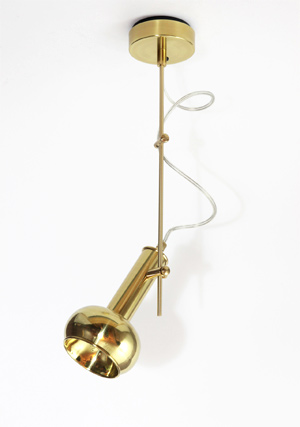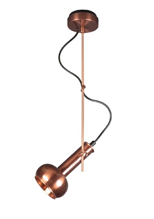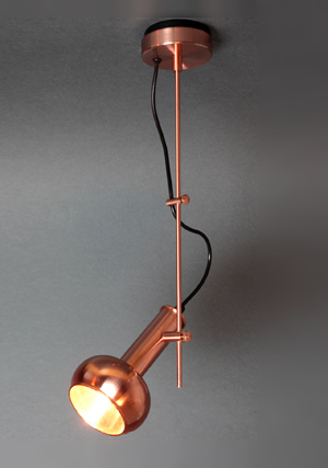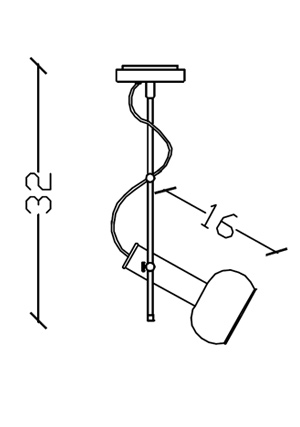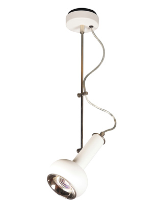 | Torch Spot can be surface-mounted. The lamp head has the shape of a flattened sphere and at the center, it is connected with a short tube. The lamp can be turned towards the desired direction by a thin rod which is connected to a cylindirical piece. The electrical cable comes out of the flat ceiling apparatus and passes through the same cylindirical piece. The lamp resembles an electric torch. This product can move up and down and turns around 360° |